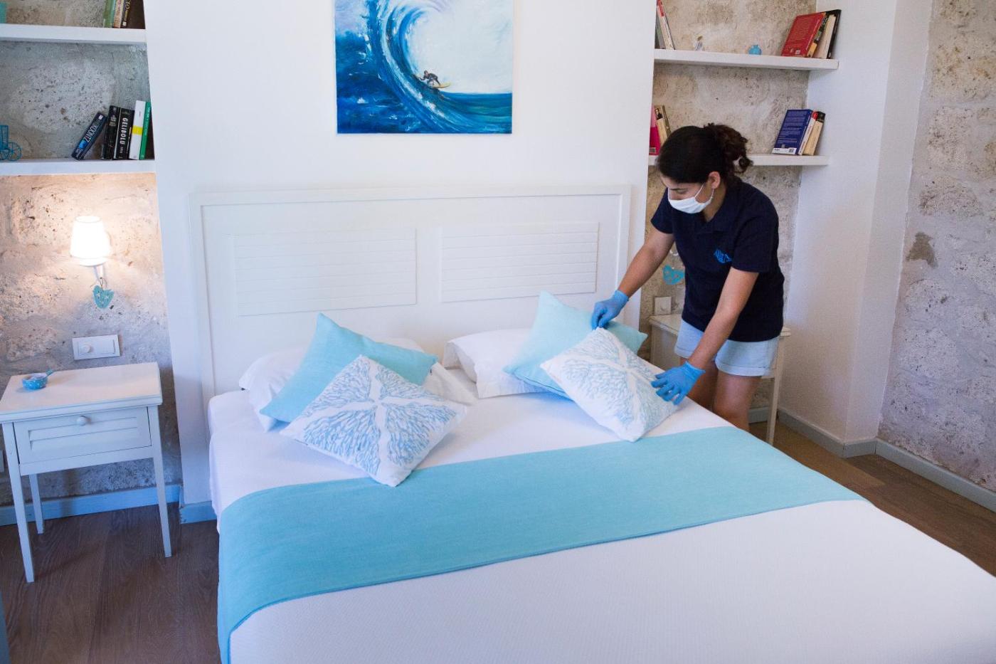Deluxe Double Room. This bright and spacious room is elegantly decorated in white and shades of blue. It offers a bay window with pool views. The bathroom is equipped with Loccitane toiletries, hairdryer and high-quality Turkish towels.