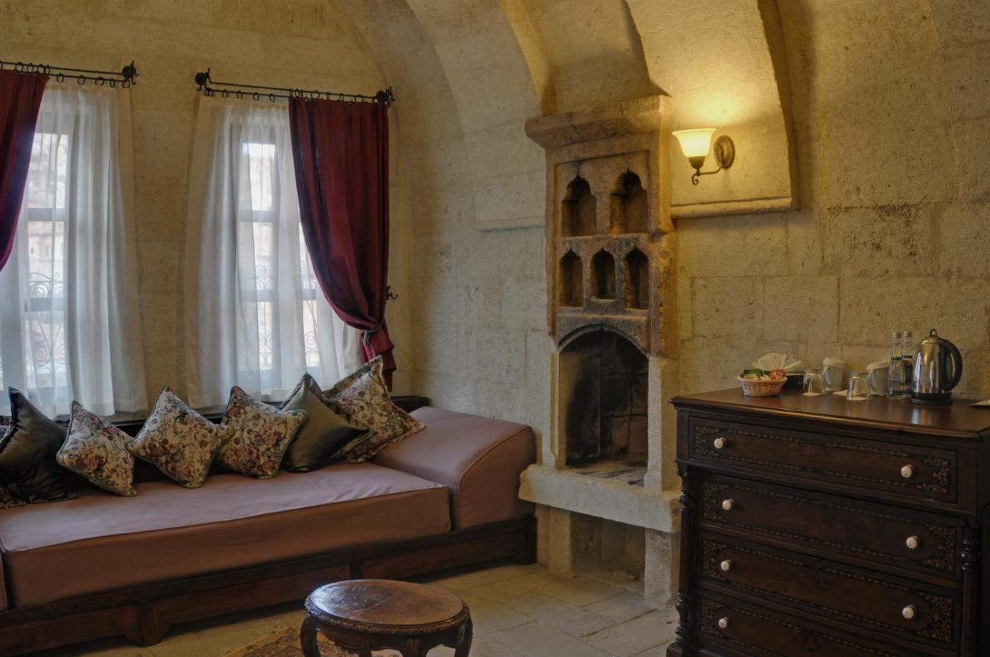 Honeymoon Cave Suite. Featuring stone walls and an arched ceiling, this spacious suite is decorated with antique furniture and handmade fabrics. It has a non-allergic orthoapedic bed, central heating and a seating area. Modern amenities include a CD player, and electric kettle with free tea and coffee set-up. The bathroom comes with Molton Brown toiletries, and a spa bath or a bath tub. Some suites also offer a fireplace. ;